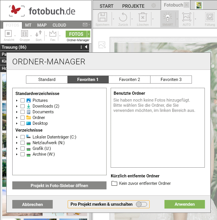 Der Ordner-Manager in DESIGNER 3 ist jetzt noch smarter und komfortabler als je zuvor. Ab sofort haben Sie die Möglichkeit, gleich mehrere Ordner-Sammlungen als persönliche Favoriten zu speichern und jederzeit mit nur einem einzigen Klick zwischen ihnen zu wechseln. Auf Wunsch merkt sich DESIGNER 3 automatisch den zuletzt ausgewählten Ordner-Favoriten und das für jedes in DESIGNER 3 geöffnete Projekt individuell. So werden die Ordner in der Foto-Sidebar beim Wechseln zwischen Projekten ganz von selbst angepasst und umgeschaltet.
